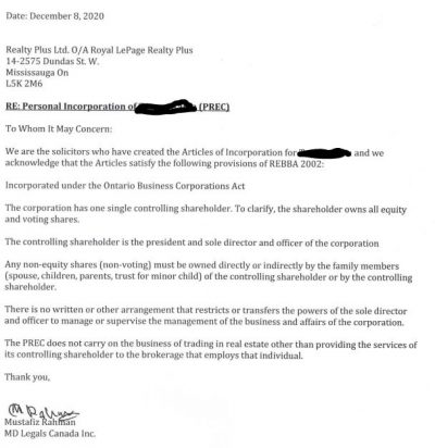• A legal letter prepared and signed by an Ontario solicitor or corporate lawyer that re-confirms the corporation's article and by-laws are prepared as per PREC regulations.
